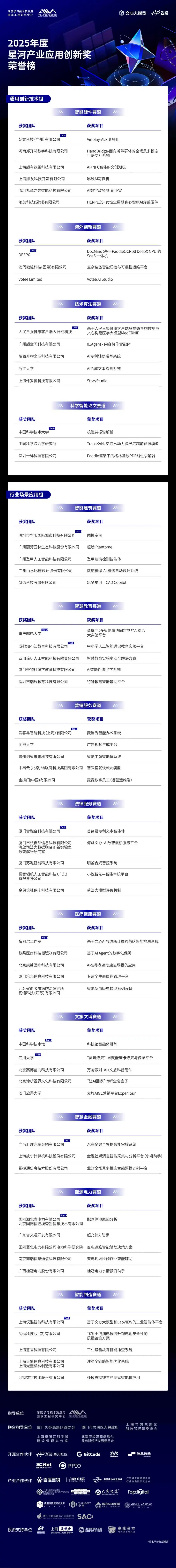 2025年,“星河产业应用创新奖”依托文心大模型和飞桨的最新技术,联合星河社区、硅基流动、国家超算互联网、Gitcode、魔乐社区等10多家模型服务平台、开源社区共同参与评选,设置通用创新应用和行业场景应用两大组别,创新增加智能硬件赛道、海外创新赛道、科学智能论文赛道等13大赛道,综合数据价值、开源创新、技术应用、业务效益、行业影响五大维度,从全国范围内300多个申报项目中遴选60个产业优质应用、创新技术方案与AI产品。这些成果覆盖智能制造、医疗健康、智慧金融、智慧教育、文旅文博等多个关键领域,展现了AI技术在各行各业落地生根、创造价值的蓬勃生命力。